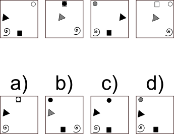 The small square moves from the top to the bottom of the square. It alternates from black to white. The spiral moves from the bottom left corner to the bottom right corner. The triangle moves laterally one place at a time. The triangle alternates from black to grey. The circle moves laterally across the top of the square from right to left. The circle cycles between three colours: white, black and grey.
